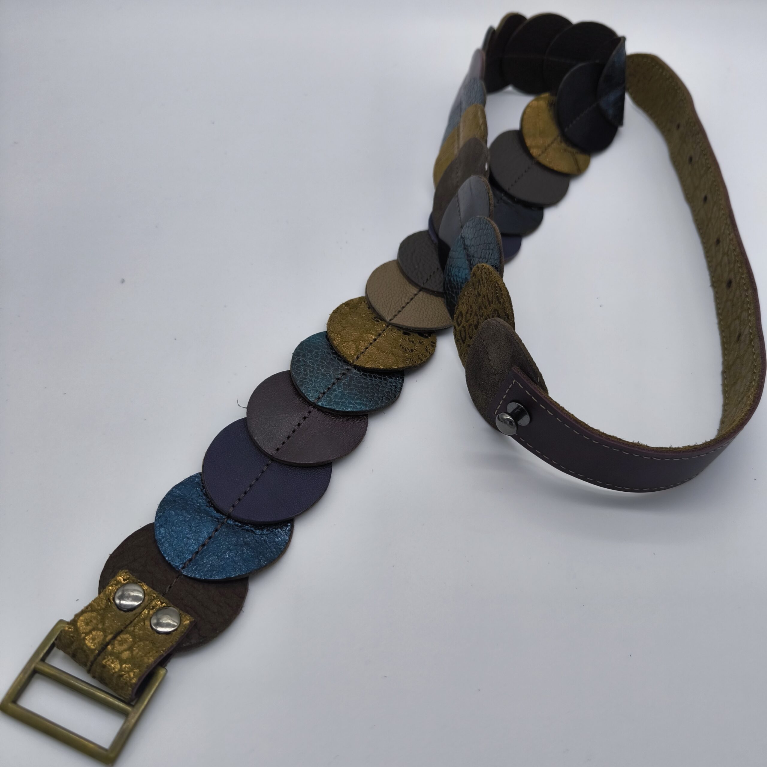 Egyedi, kézzel készített öv egymásra illesztett bőrkarikákból, amely különleges textúrát és karaktert ad bármely öltözéknek. Kényelmes viselet, hétköznapi és alkalmi szettekhez is stílusos kiegészítő.
