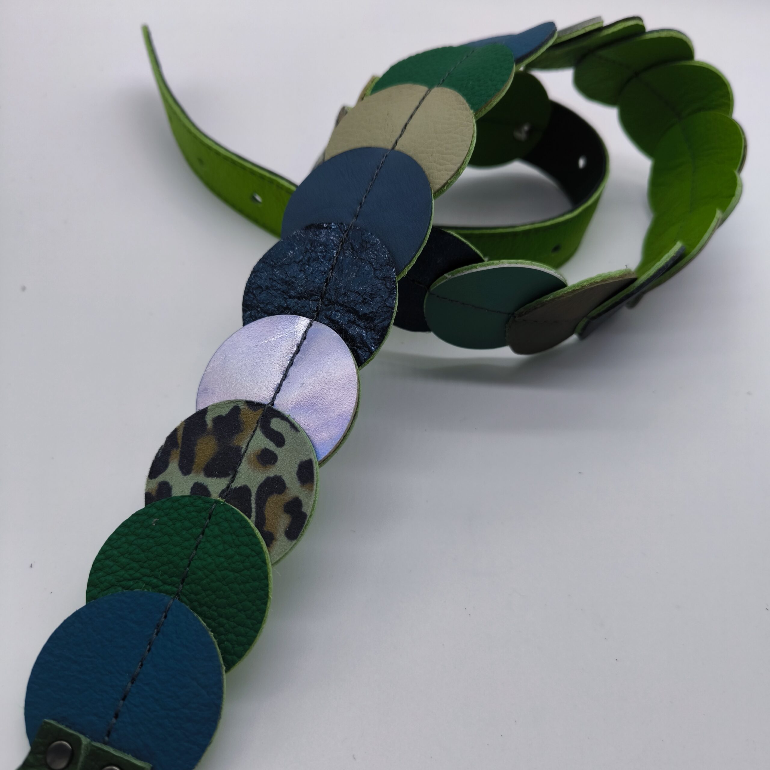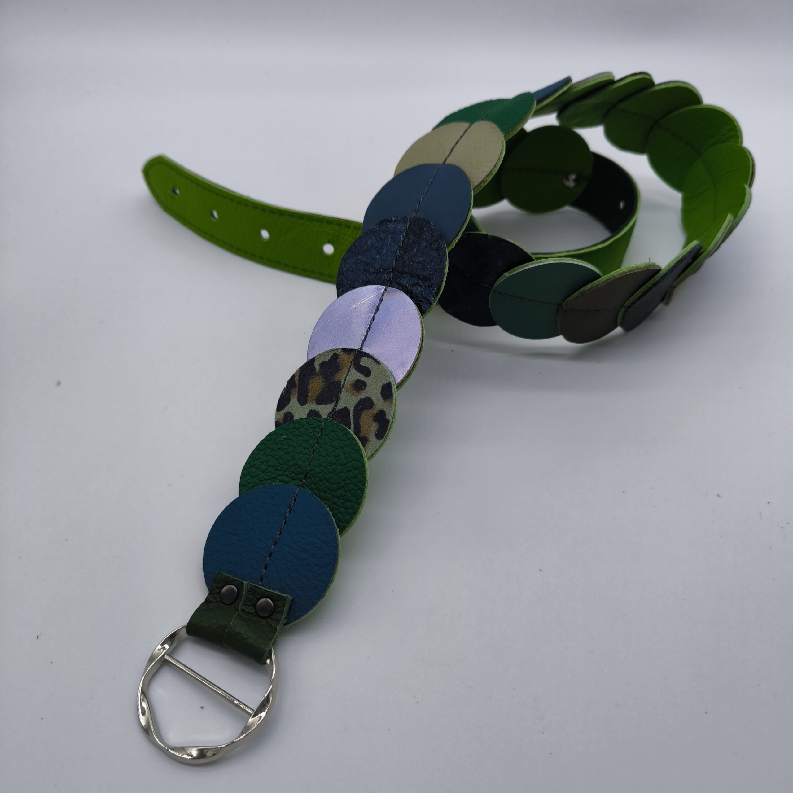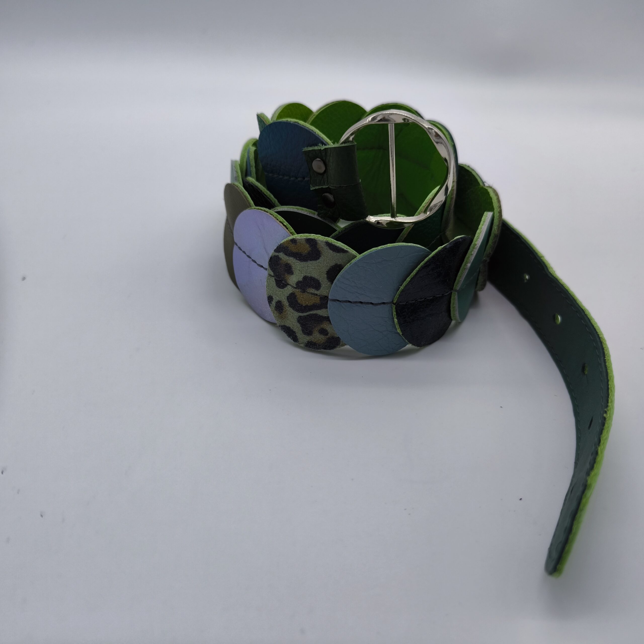 Egyedi, kézzel készített öv egymásra illesztett bőrkarikákból, amely különleges textúrát és karaktert ad bármely öltözéknek. Kényelmes viselet, hétköznapi és alkalmi szettekhez is stílusos kiegészítő.